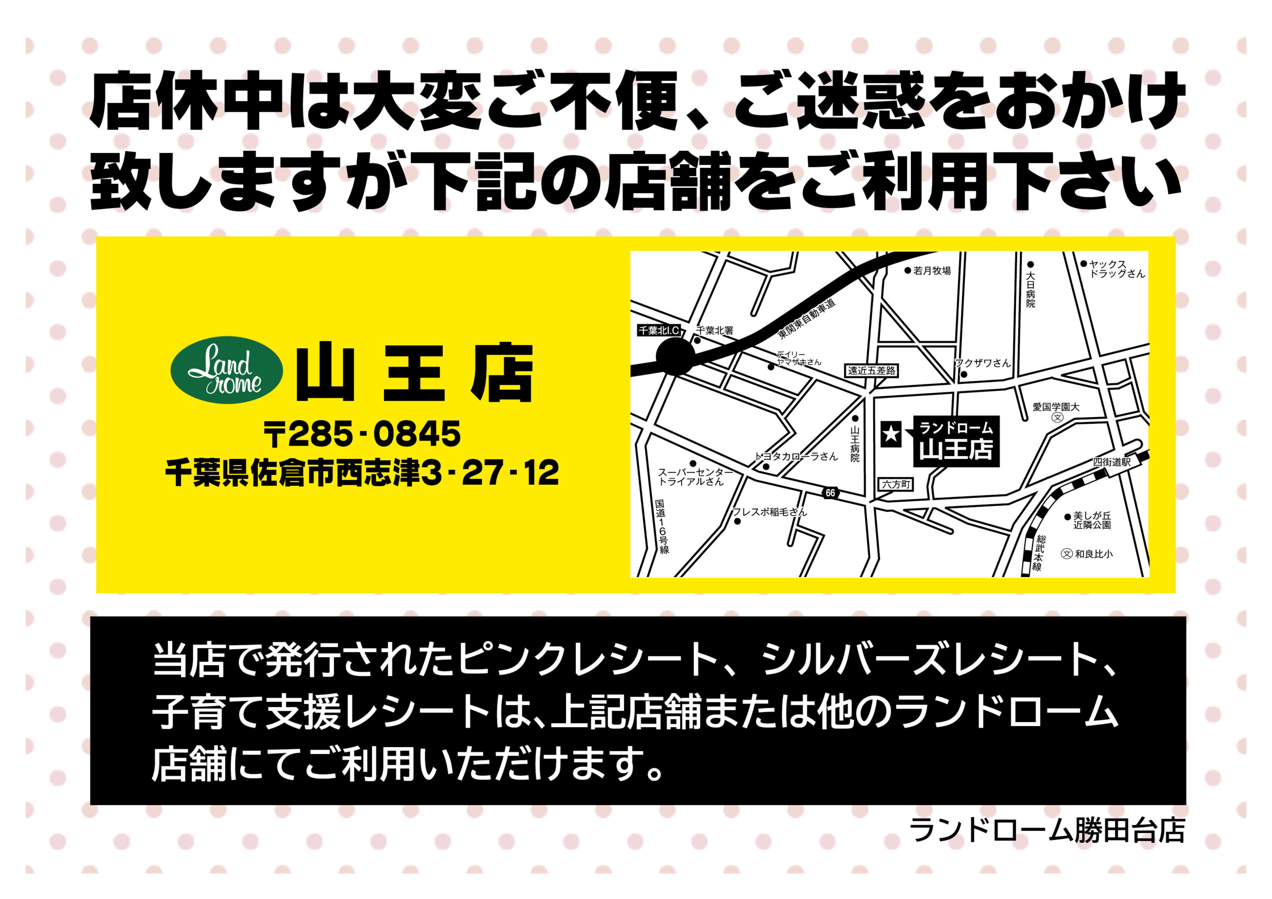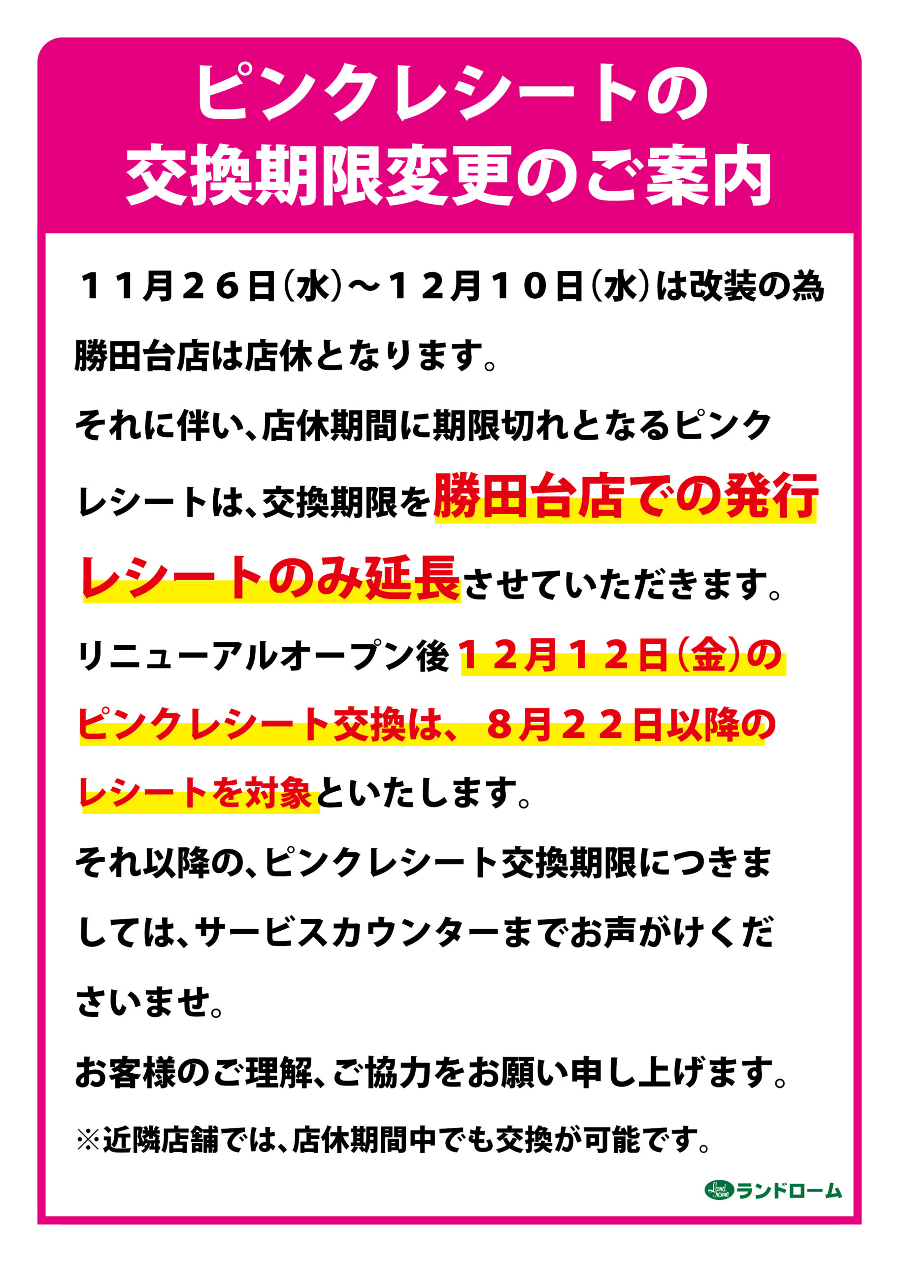 > ランドローム勝田台店 改装工事に伴う営業時間変更等のお知らせ