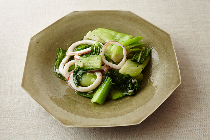 1. いかは足とわたを一緒に抜き、流水でよく洗い、水気をふいて軟骨を取る。胴は厚さ3~4mmの輪切りにし、足は食べやすい長さに切る。チンゲン菜は葉はざく切りに、茎は縦半分に切ってから薄切りにする。Aは混ぜ合わせておく。