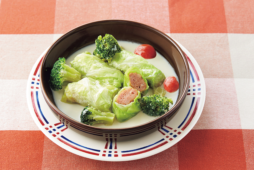 - フライパン(直径20cm)に1を巻き終わりを下にして並べる。〔POINT〕すき間ができないように並べると、ロールキャベツの形がくずれません。