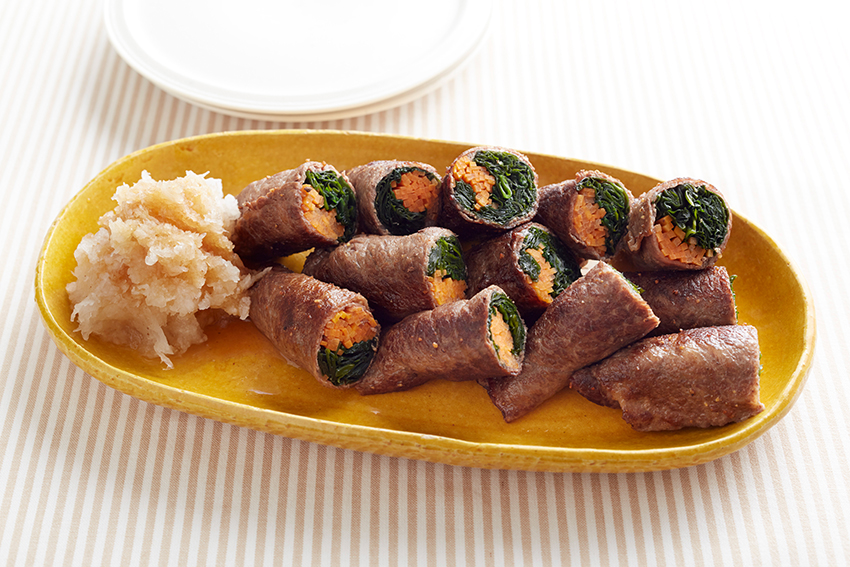 - 牛肉は1枚ずつ広げ、塩、こしょうをふり、わかめとにんじんを1/6量ずつのせて巻く。