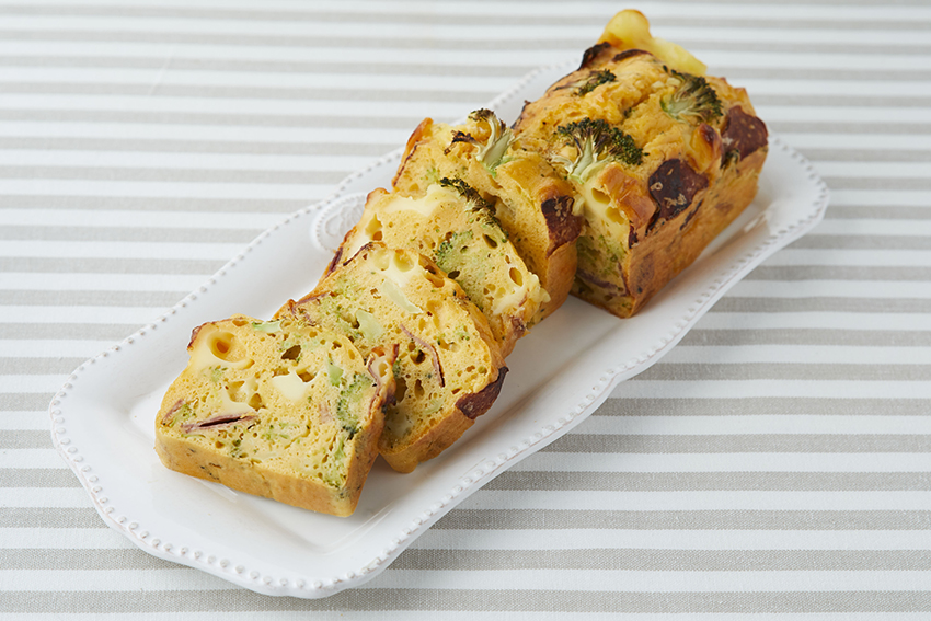 1. ブロッコリーは小さめの小房に分け、縦に幅5mmに切る。チーズは1cm角に、サラミは半分に切り、それぞれ飾り用に少し取り分ける。型にオーブンシートを敷く。