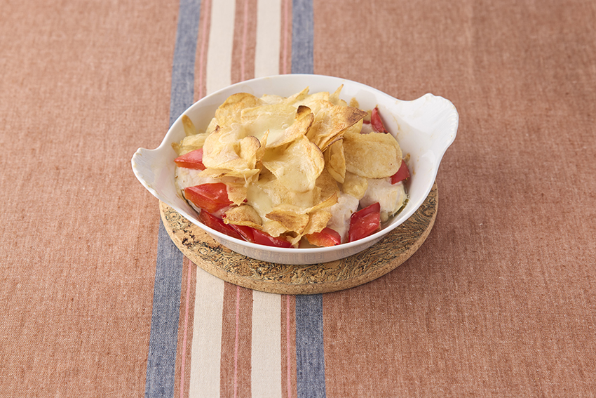 - ポテトチップスを大きめに割ってちらし、チーズをかける。再びオーブントースターに入れ、焼き色がつくまで2~3分、様子を見ながら焼く。