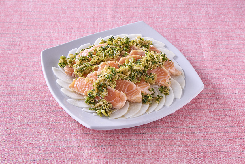 - サーモンは長さを半分に切り、沸騰した湯で30~40秒ゆでる。1に加えてからめ、冷蔵庫に入れて20分漬ける。
