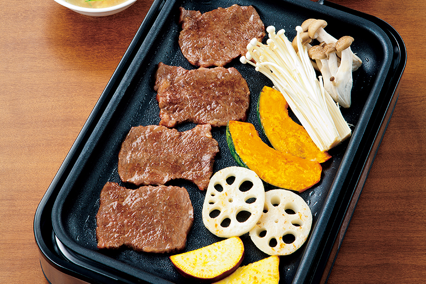 3. 熱したホットプレートに油を入れ、牛肉と1を焼き、火が通ったものからポン酢しょうゆ、2につけていただく。