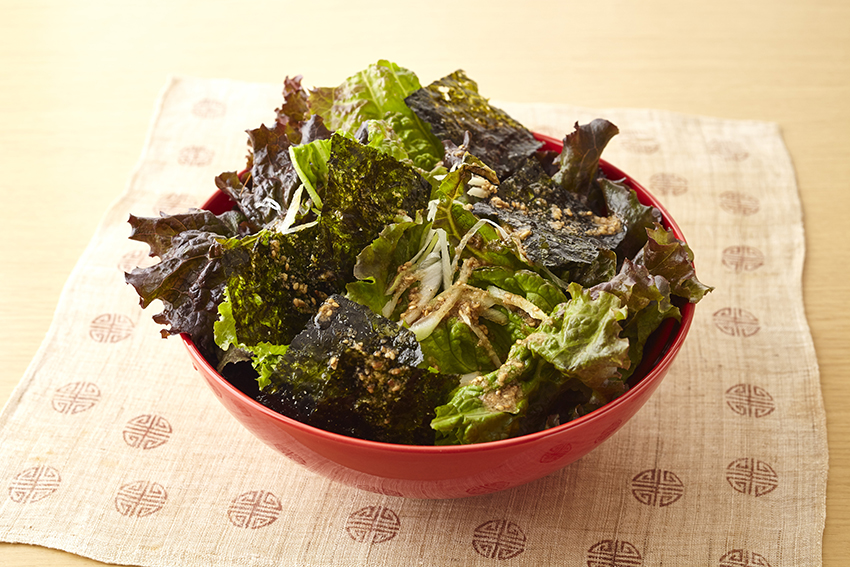 2. ボウルにサニーレタス、韓国のりをちぎり入れ、長ねぎを加えてサッと混ぜる。器に盛り、Aをかける。