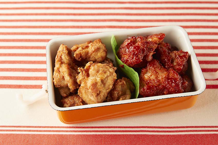 2. 揚げ油を中温に熱し、鶏肉に天ぷら粉をまぶして入れ、3分揚げる。返して2分ほど揚げて取り出す。揚げ油を高温にし、鶏肉を戻し入れて1分ほど揚げ、油をきる。